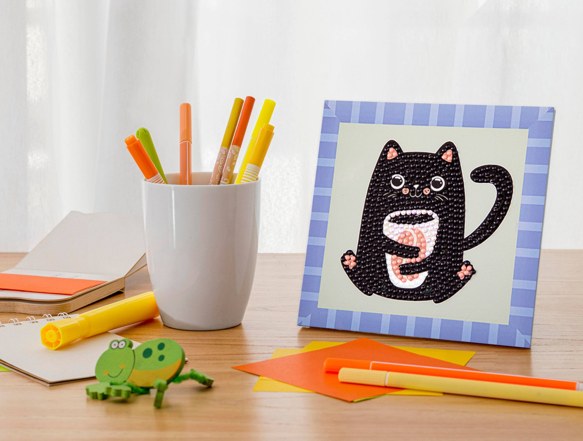 Perk up your craft time with the Coffee Bean Kitten diamond painting kit! This design features a cozy kitten holding a cup of coffee. It comes complete with a printed border, stand, and hanging tab.