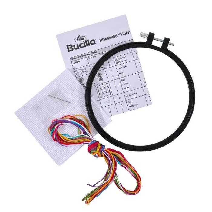 Grounded and warm. Colors that connect your soul to the earth and inspire free expression of movement. Kit includes 100% cotton 14ct white Aida fabric, a 6" black plastic hoop, embroidery floss, needle, and instructions. Finished size 6". Intermediate level.