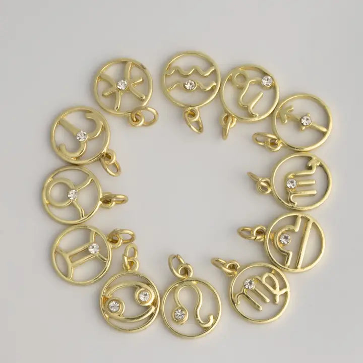 Channel your star sign. This 12-piece gold-tone zodiac charm set features all the astrological signs, each with a sparkling rhinestone accent. Perfect for DIY charm bracelets, necklaces, earrings, bag charms, and gifting by sign. Astrology meets chic with these celestial must-haves that never go out of style.