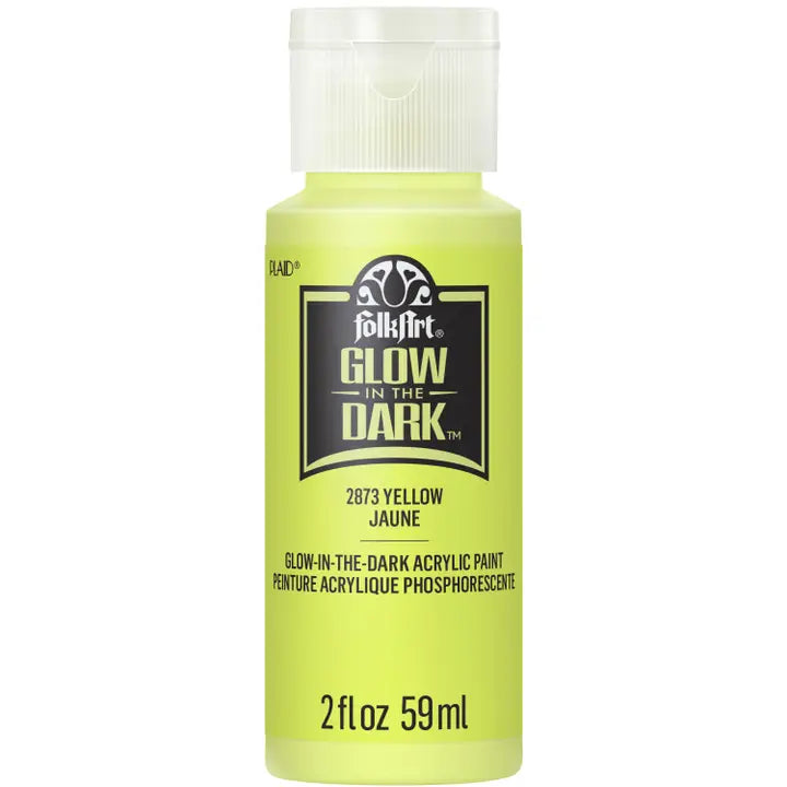 FolkArt Glow-in-the-Dark acrylic paint brings a vivid glow to any project. This paint features a thick, creamy texture that applies smoothly and dries to a matte finish. For optimal results, apply two or more layers, or use a white undercoat, and charge the finished projects under a black light.