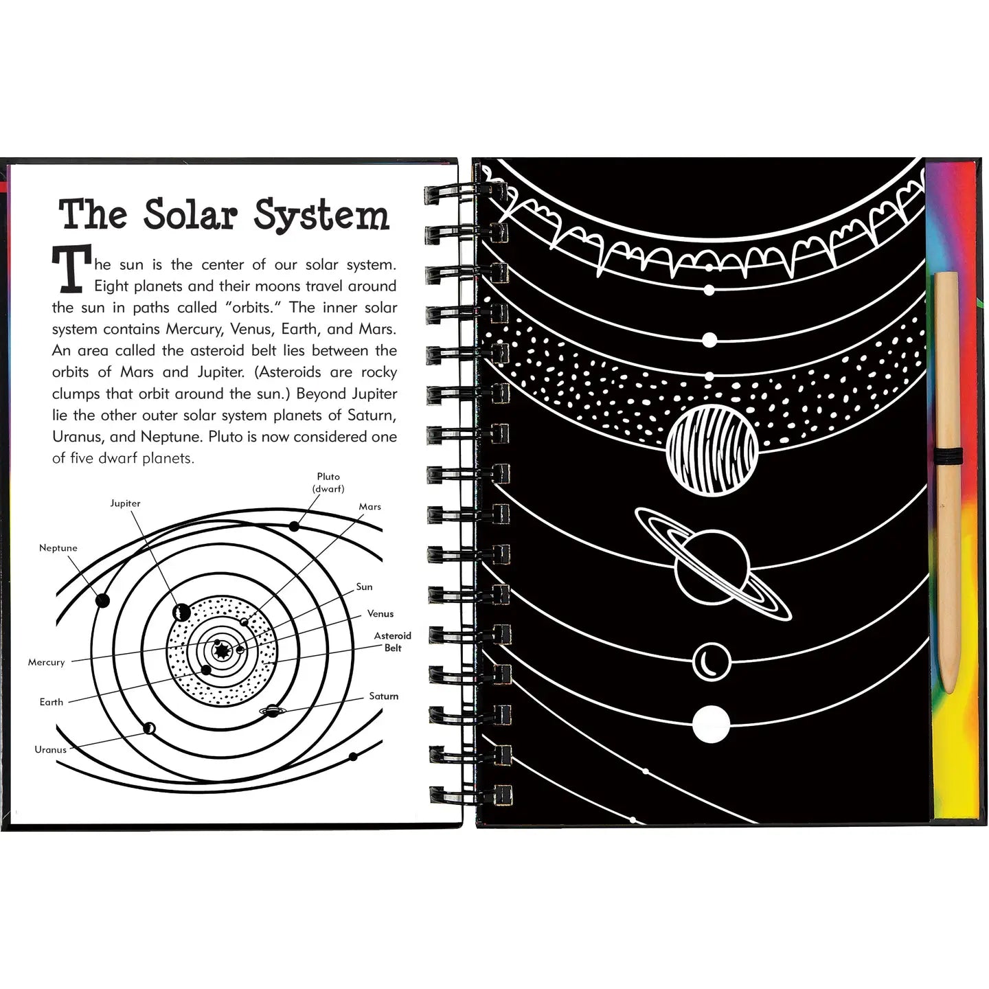 Blast off into outer space as you scratch your way through the solar system! Use the stylus included to scratch away the white outlines and uncover sparkly foil, colorful swirl, and even glow-in-the-dark colorful pictures of planets, moons, comets, meteors, and more. This is a Trace-Along Scratch and Sketch ! Use the wooden stylus included to trace the white outlines on the black-coated pages and reveal the brilliant colors beneath! Makes a fun way for young children (5 and up) to build confidence in their creativity. They can also use the extra sketch pages in the back to draw their own solar system pictures. Book contains 20 black-coated scratch-off pages, 20 illustrated pages with informative text, and 20 extra pages for independent drawing and sketching. The wooden stylus is shrink-wrapped with the book. Suggested ages: 5 and up.